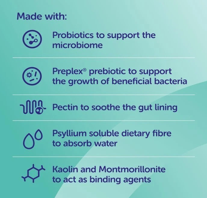 - Dual binding agents to firm up the faeces